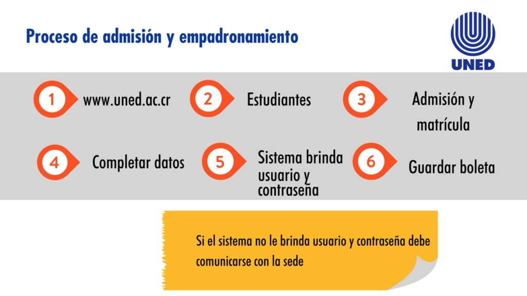 La UNED no tiene examen de admisión, pero se debe realizar el empadronamiento el cual es el «acto obligatorio, que cada estudiante debe realizar una vez que ha sido admitido y antes de efectuar la matrícula, mediante el cual se inscribe en una de las carreras o los programas de la oferta académica, previa comprobación de los requisitos de ingreso establecidos para cada uno de ellos» (Reglamento General Estudiantil).