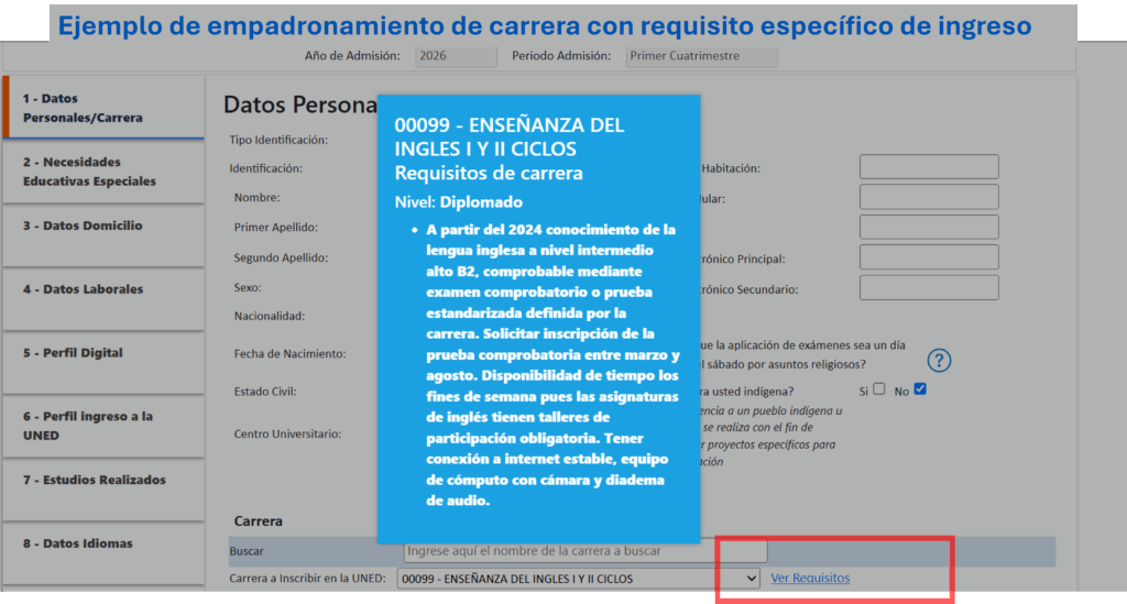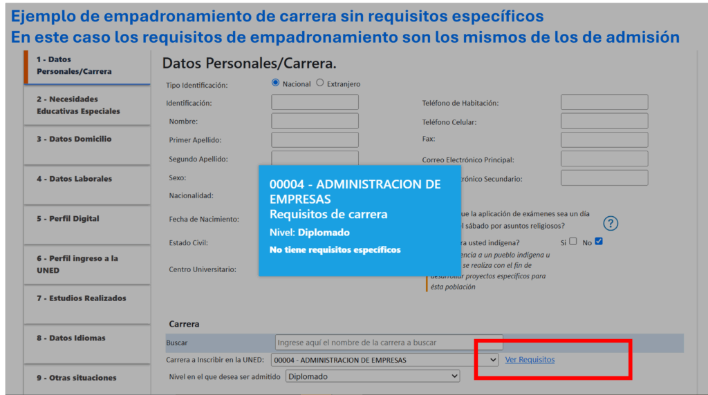 Los requisitos se detallan en la página oficial de cada carrera dentro del sitio de la UNED: Carreras | Universidad Estatal a Distancia