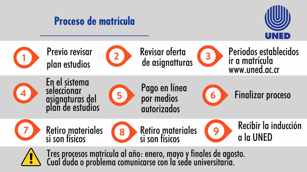 La matrícula se realiza en línea a través del sitio web oficial de la UNED, en las fechas establecidas en el calendario académico.